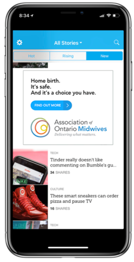 Specifically we identified posts that indicated people were expecting by what they were posting online in social media (e.g., “We’re pregnant!“, “Going to our first ultrasound”) or images they were sharing (e.g., baby bump selfies, ultrasounds). Then the next time they were on their mobile device on a different site, they were served an ad letting them know about home birthing options.